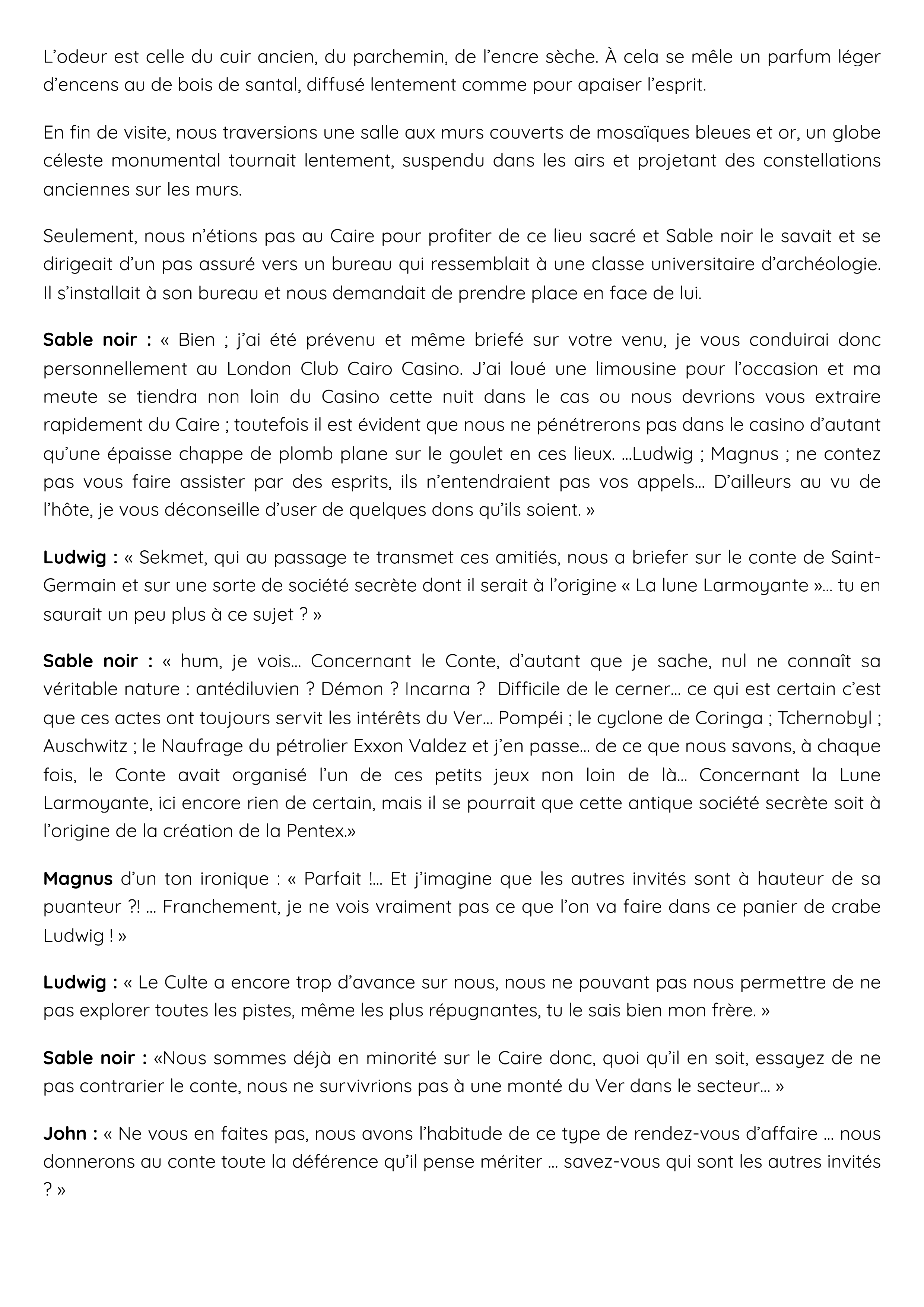 Sable noir : « Bien ; j’ai été prévenu et même briefé sur votre venu, je vous conduirai donc personnellement au London Club Cairo Casino. J’ai loué une limousine pour l’occasion et ma meute se tiendra non loin du Casino cette nuit dans le cas ou nous devrions vous extraire rapidement du Caire ; toutefois il est évident que nous ne pénétrerons pas dans le casino d’autant qu’une épaisse chappe de plomb plane sur le goulet en ces lieux. …Ludwig ; Magnus ; ne contez pas vous faire assister par des esprits, ils n’entendraient pas vos appels… D’ailleurs au vu de l’hôte, je vous déconseille d’user de quelques dons qu’ils soient. »