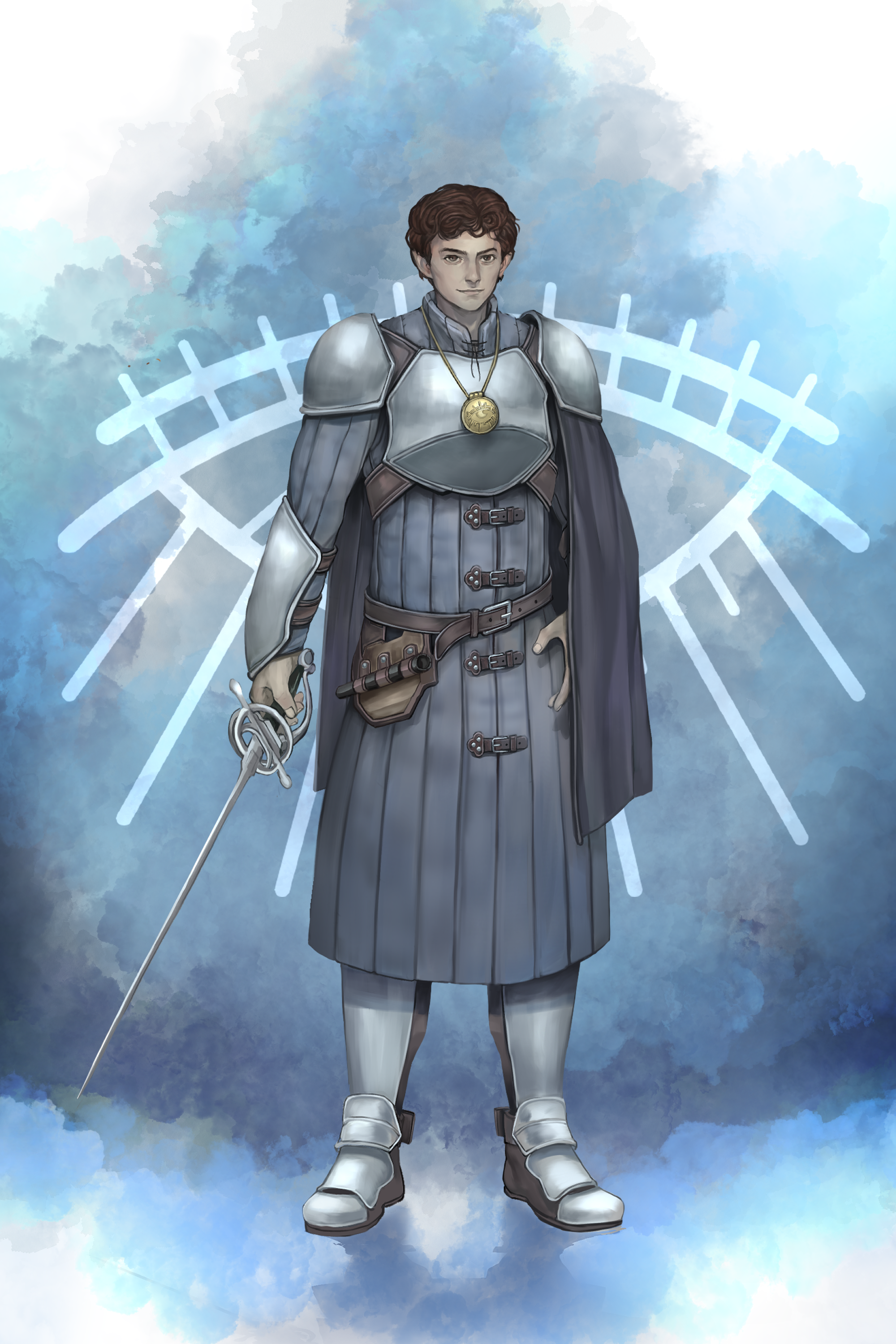 Elion wears a long dark brown robe. The simple fabric covers both his arms and everything above his knees; his trousers are of a darker shade. A Shield is strapped to his back and Elion always keeps a Rapier by his side (although he seeks to avoid using it).