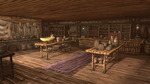 Wooden building with broad windows. A sign that's painted to look like its overgrown by Wisteria reads General Store in a precise and fancy script. Shelves and tables filled with merchandise. Ella can provide the necessities of small-town life as well as general advice for the more adventurous sorts. Despite the basic farm implements, seeds, and general supplies, it has a look of a place that has taken great efforts to feel quaint.