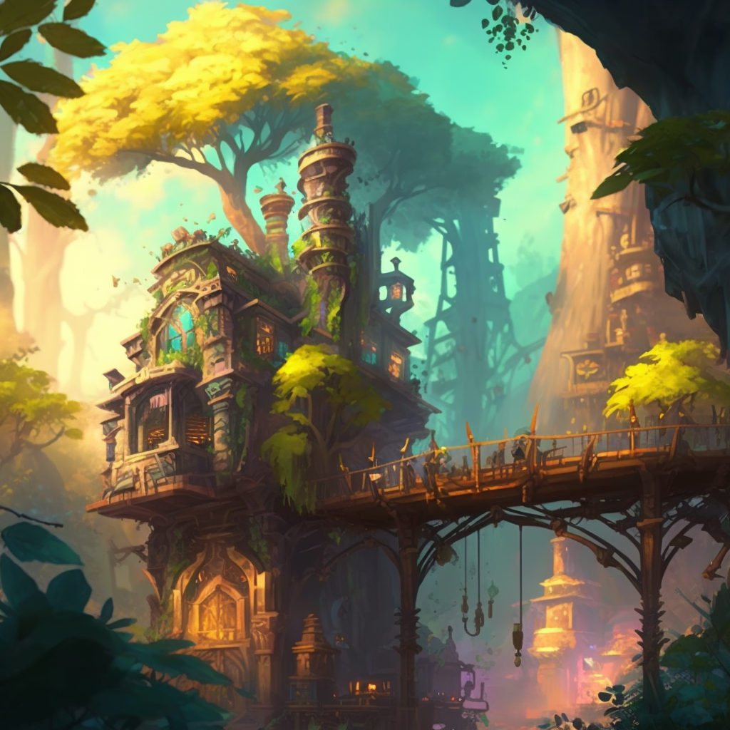 Bosaadak (boh-SAH-DAHK) sits on the western coast of Bosaa and is its largest city by far. It is partially visible as the island is approached from the seas. Large, towering structures stretch out into the water and connect to floating docks, moored some fifty yards from shore. The towering structures feature a series of large elevators that raise and lower goods between the docks and the city’s lowest levels. As one moves up from the docks and farther into the jungle, the full majesty of the city becomes clear. Eighty feet above the jungle floor, a city of expansive buildings built into and around the massive trees. Three distinct tiers of the city can be seen, rising toward the center of the city, which is built around Xhurna (JOUR-nah), which roughly translates as the Gods’ Pillar. Multi-level buildings are built upon thick supports that stretch between the arboreal giants of the jungle, with sturdy bridges connecting areas of the city.