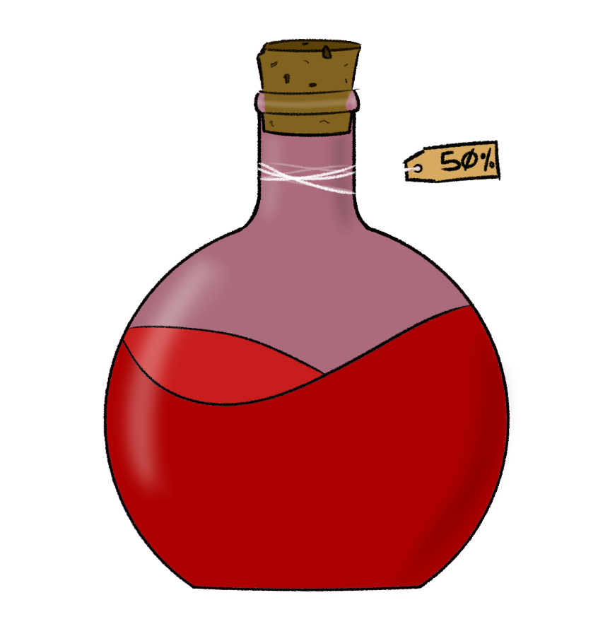 Healing potions are expensive! Turns out some unscrupulous herbalists discovered most of the cost goes into making them palatable. You can buy these unflavoured healing potions at a steep discount! They smell, taste, and even look, absolutely vile. The stronger the potion the more concentrated the ingredients so they only taste worse the more you heal.