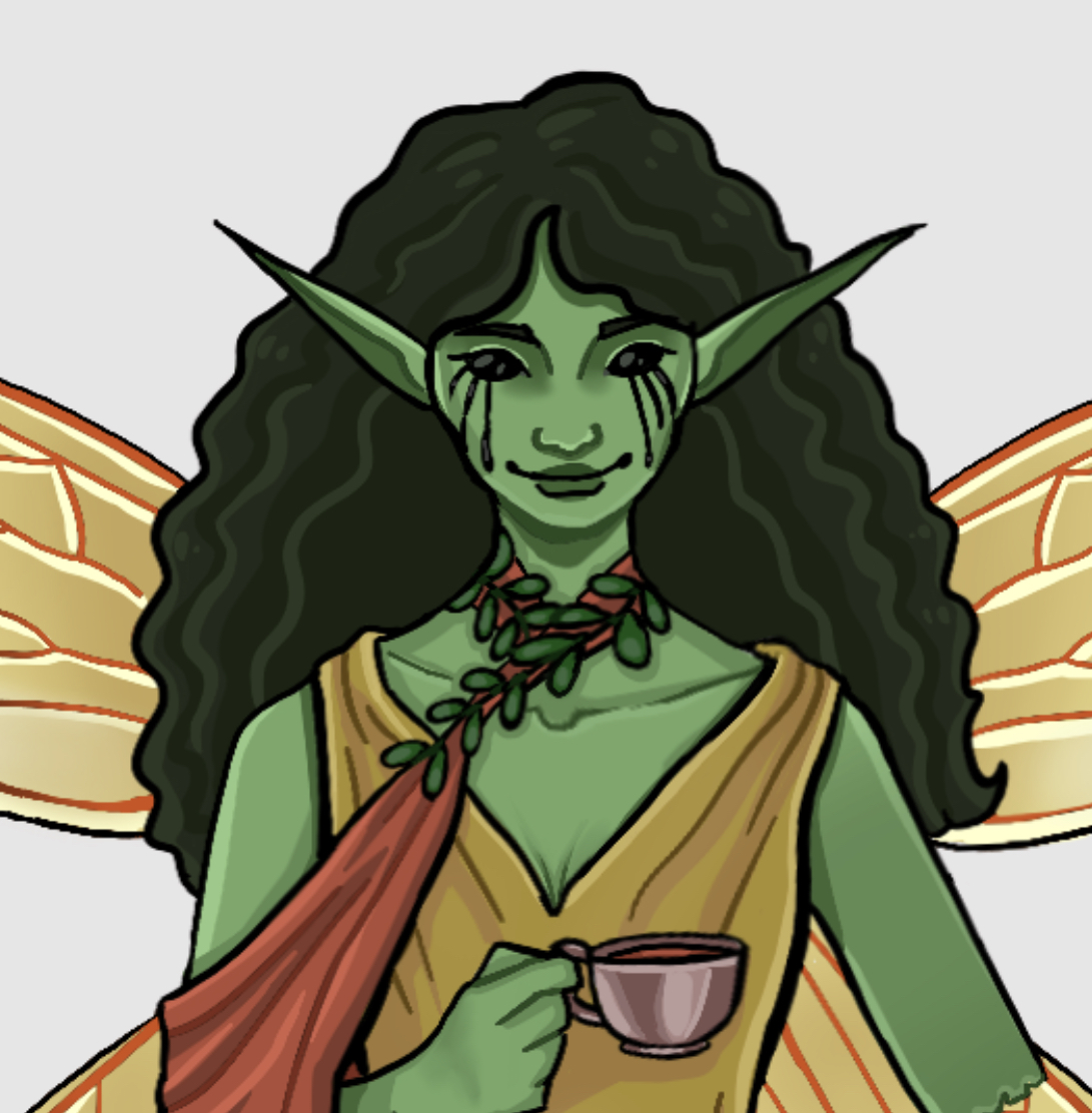 Deirdre is an enigmatic time-traveling fey architect, and Orna Ordan's godmother. The party first encountered her in the house of Ordan Halfhand, safeguarding his soul. They also met who they believed to be a younger incarnation of Deirdre on Mt. Waterdeep, and believe that an older incarnation may be trapped in the Amber Temple. Deirdre seems to have inspired multiple people to build Apparatuses, including Artimus Fidatov, whom she may have also trained in architectural design. A Chultan couatl made reference to a river spirit that matched Deirdre's description and was a sister of Somnara, who herself has claimed to be Deirdre.