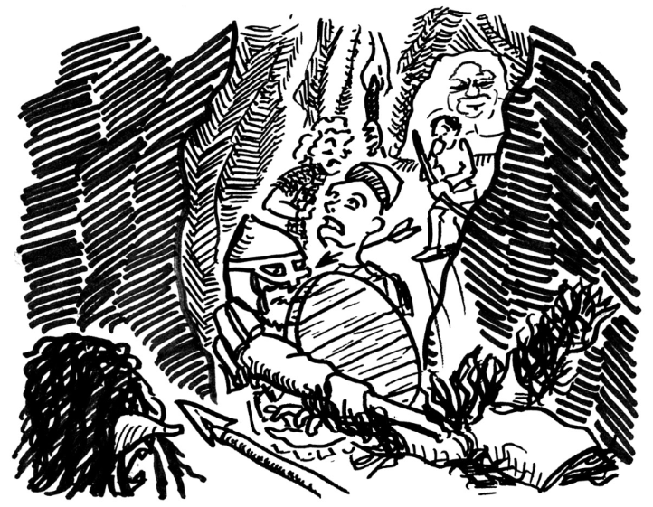 Unwilling to face the larger figure, they flung burning oil upon the hairy ones and charged, using the narrow tunnel to offset their enemies’ greater numbers. After hacking and slashing away, Kaiden took a blow and allowed Rarder to take his place at the front, but the second rank afforded no safety from a poorly-shot arrow from Emmett and Kaiden perished with a missile through the neck.