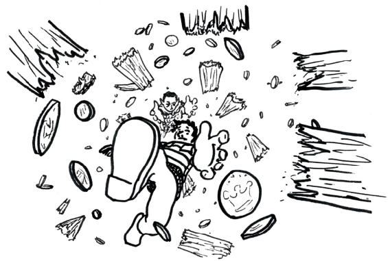 Tom started ascending the tower, poking at the rotten, elderly floorboards. The others, still on the ground floor, noticed a few coins tumbling from the centre of the floor above. Looking for the source, Tom stepped into the room, and the entire floor collapsed. Below, Tarek and Rarder leapt aside while Calamatix stepped forward to try and catch his heavy, plate mail-wearing ally.When the dust settled, Calamatix and Tom lay with broken necks amid a pile of broken timber and 250 gold coins.