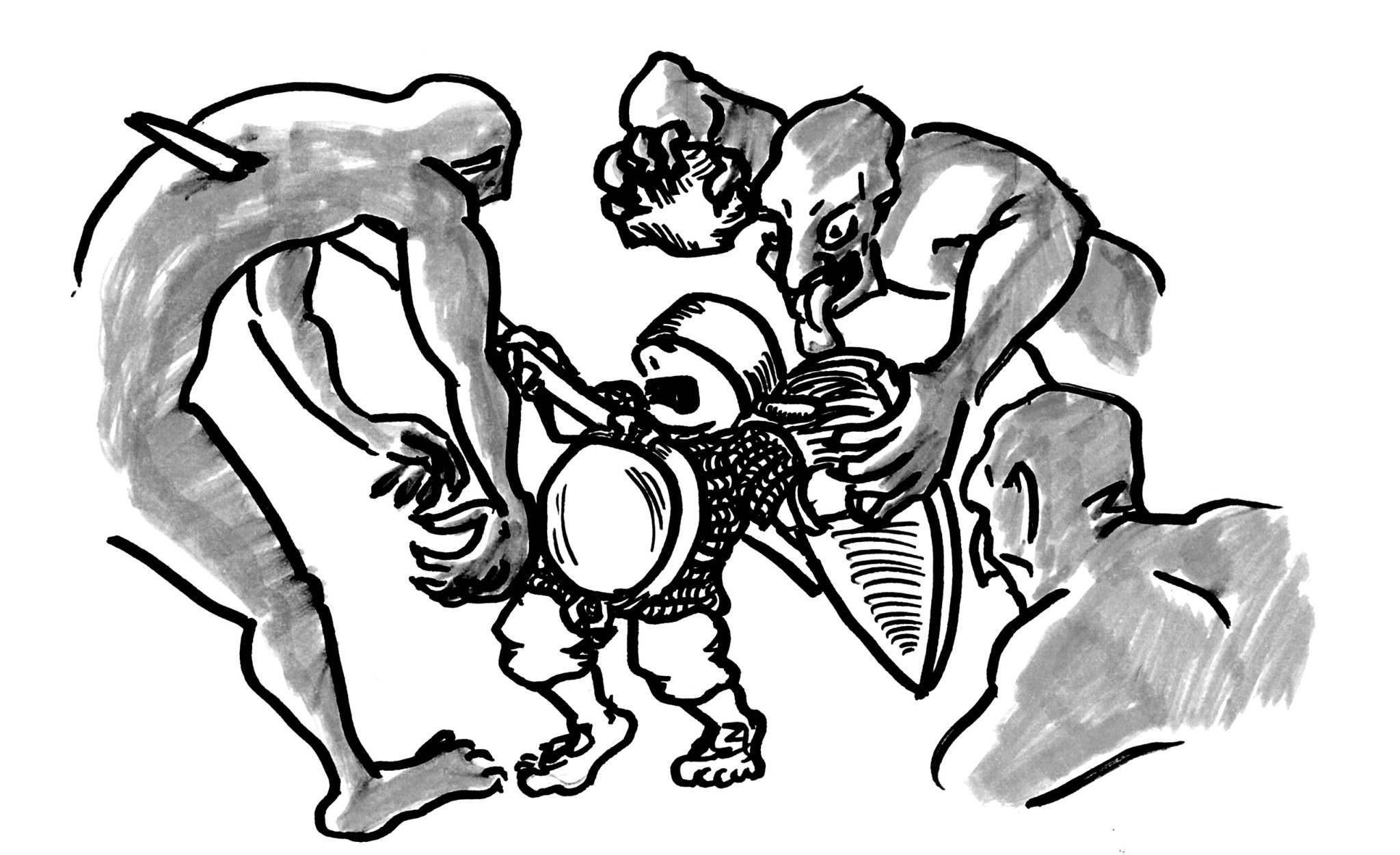Sneaking through the familiar folding door, the party followed the central circular corridor around, footsteps echoing off the silent stone walls and floors. They examined a door near the entrance, cold to the touch. As the dwarves crouched down to listen at the keyhole, Gaztelua let out a cry of alarm from the rear – several ghoulish assailants sprinted into the torchlight, tongues lolling. The adventurers leapt into formation and fought back – their greater experience tipping the scales in their favour though several were left paralysed by the end. Harry was slain, skewering several with his magical spear as he went.