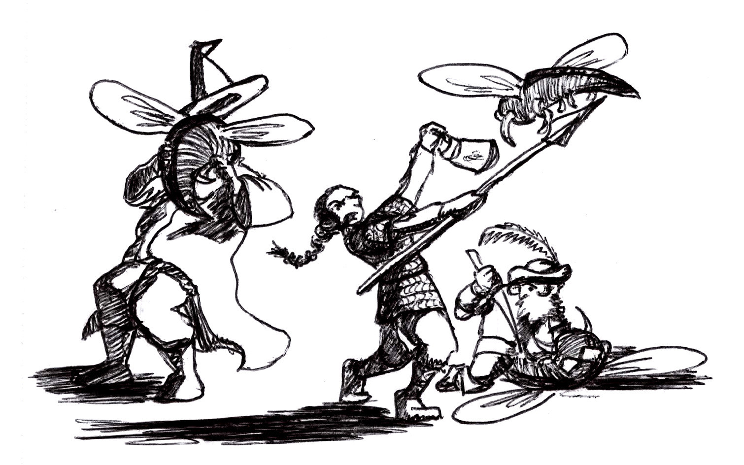 When nothing did so, the adventurers descended into the depths, leaving some retainers to guard the camp and horses. All was quiet down below. One door led to an empty room but for three brass rings set into the wall, and another lead to a vast hall where ceiling and floor stretched out into darkness. Opting instead to head down a stairway, the party readied to descend further while Rarder spiked shut the vast hall door. Unfortunately the sound of his hammering drew them all to the attention of some great flying stingers, and a swarm descended upon the group.