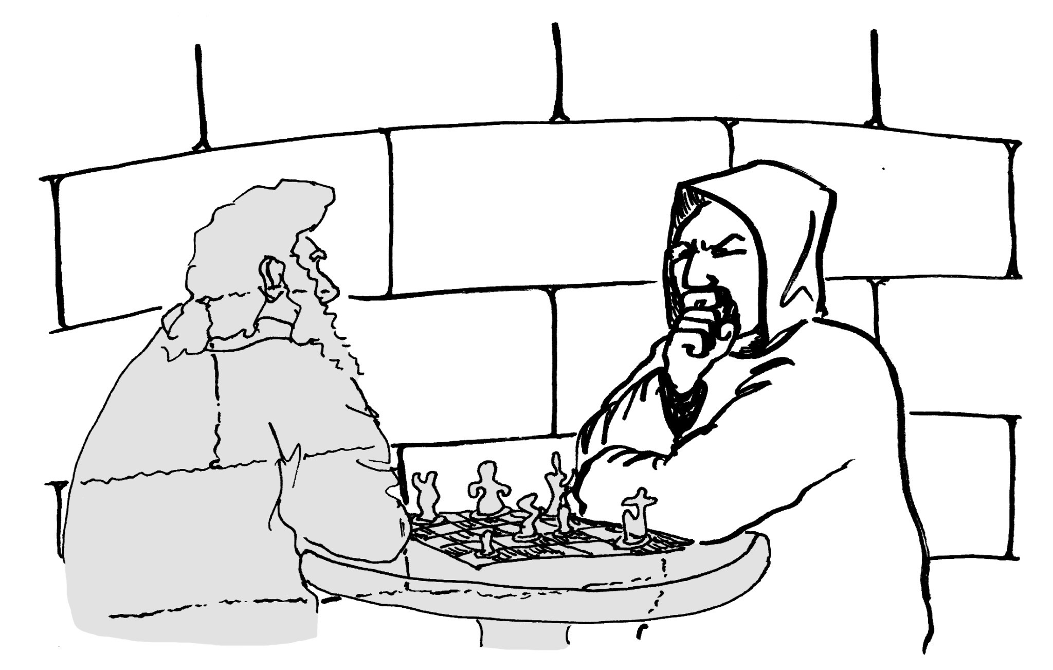 While most of the group set about unspiking the door to the main hall, Koko had a poke around the room featuring three great rings in the wall, setting foot into it for the first time. A ray of light flared out from each ring and formed an ethereal being who challenged the cleric to a game. Staking one of the party’s magical amulets, Koko triumphed in short order and was presented with a spectral key which nevertheless weighed heavy in his hand. The ghostly gamer faded away.