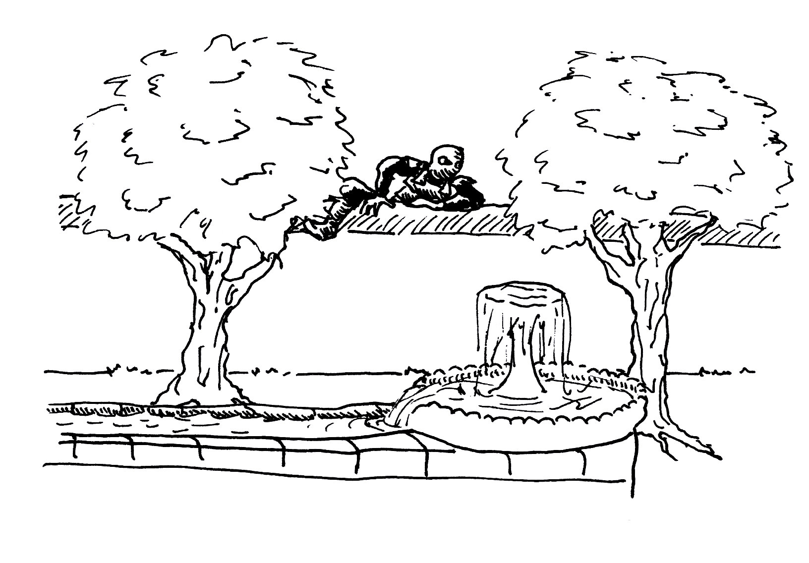 Approaching the wall around the courtyard garden, the party sent Knuckles up and over with a rope to allow for a discrete way in. The garden remained a scene of great tranquillity and peace, the fountain trickling away into its pool as the trees sighed in the wind. As Dulo investigated the fountain, from which he sensed a magical presence, the rest of the party started exploring the rest of the garden walls.