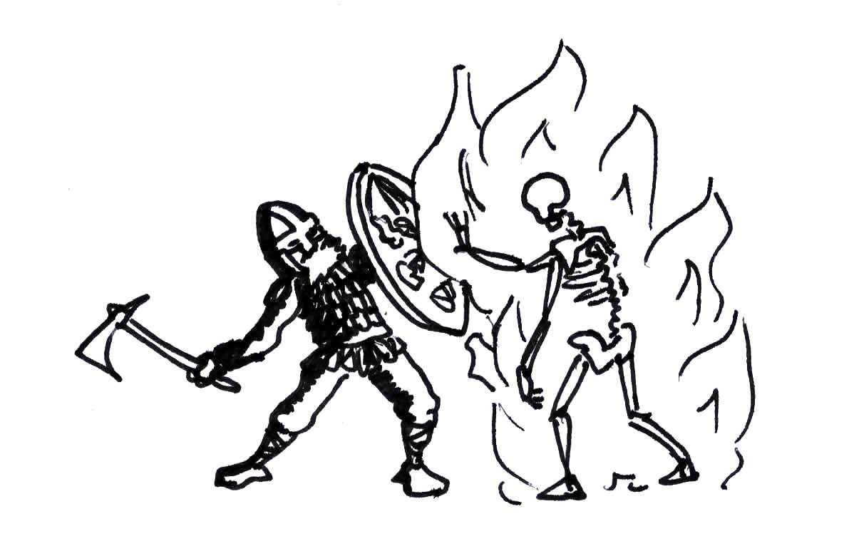 Following the snaking corridor, they turned a corner and found themselves confronted with several skeletons, bones encrusted with black runes, stood outside another door. The two sides clashed, and Koko called upon Mar Nod to repel half their number. As the front rank of Rarder and Hats struck those that remained, each skeleton burst into flames and engulfed the pair. The human was protected by his enchanted shield, but Hats took the blast full on. Nor were the skeletons seemingly harmed by the fire, and they fought back against the party.