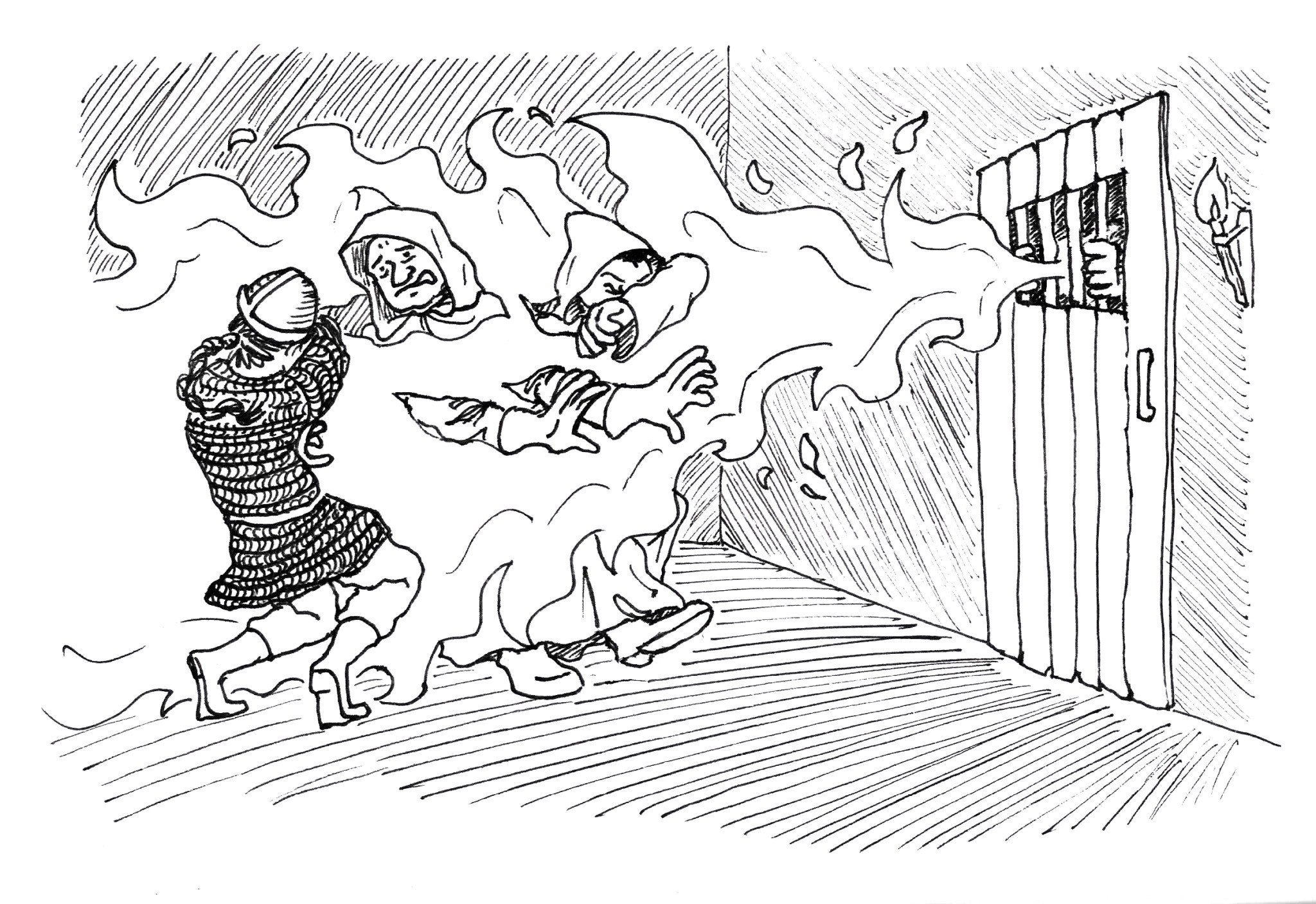 Spying eleven occupants, a mixture of hairy ones and familiarly maroon-hooded humans, the party once more made use of Knuckles' magical firebreath-enabling armour. They handed the thief a pair of oil flasks, and immediately after throwing them through the bars he heaved a gout of flame into the room, instantly eliminating half the occupants. As more continued to fall, Rarder burst through the room and, ignoring the flames licking at his legs, flung himself across the room's other door to prevent any escape. Lynal blinded a hairy one with great beams of arcane light pouring from its eyes, and the last few of its comrades flung down their weapons in surrender.