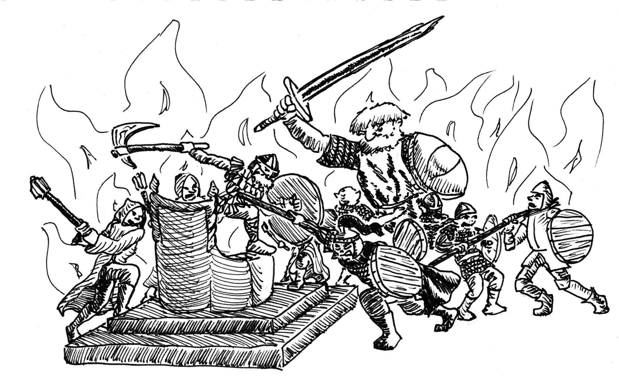 Rarder leapt up upon the throne and roared out a challenge to the King Under the Mountain, a challenge which was met by an echoing roar as a large hairy one charged from a doorway, flanked by guards and several hairless ones. Koko and his retainers joined the enormous Alf in charging to Rarder's aid, several of the hooded ones likewise rushed in and battle was met.