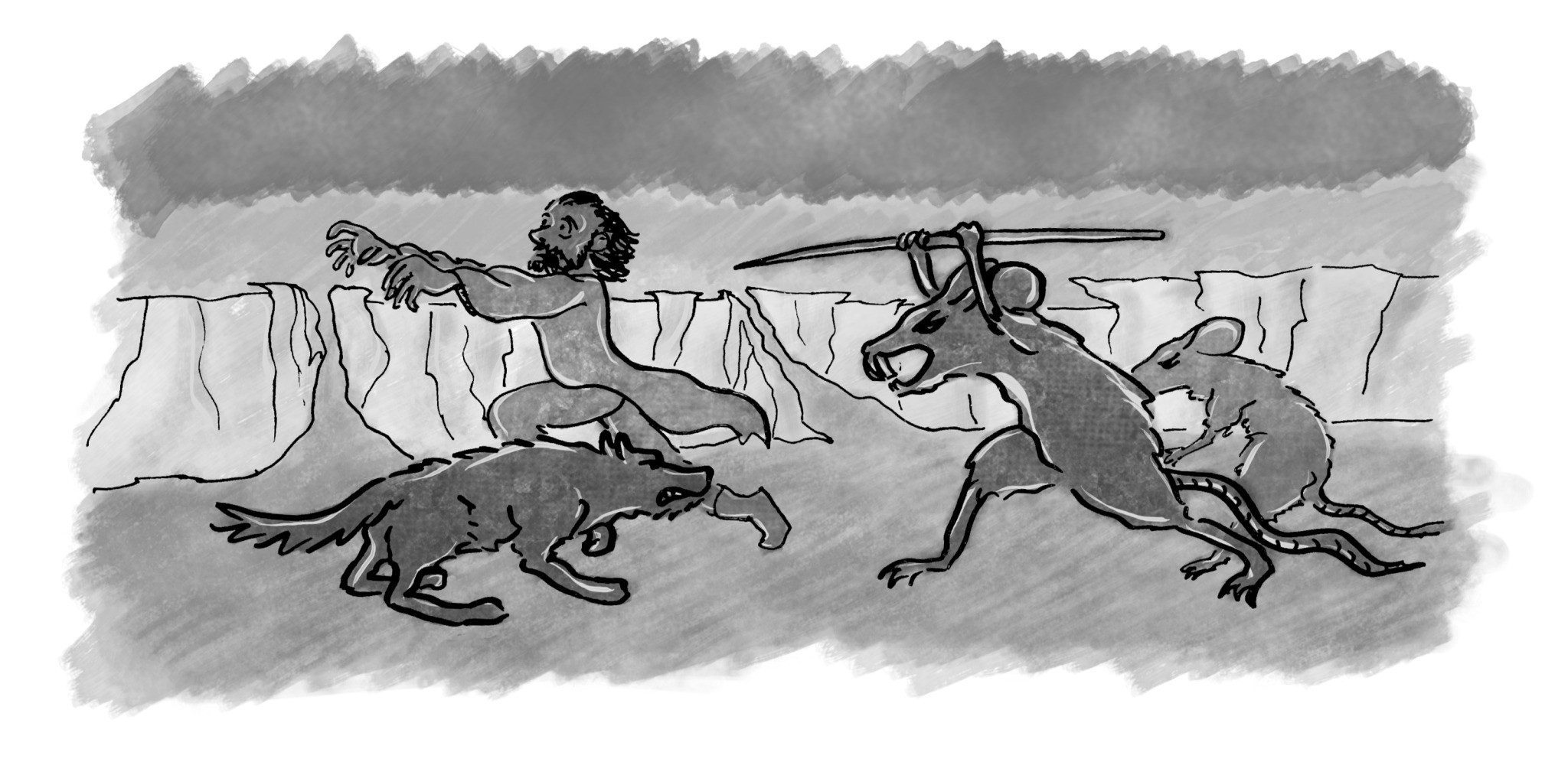 While Dulo tried to keep his distance from either frontline, his comrades quickly rearranged themselves to protect the squishy middle rank. Despite the surprise attack, the adventurers and their allies vanquished their foes, though the wildies had lost nearly two thirds of their number, and one of Koko's retainers had been knocked from one of the bridges by a flung spear and plunged into the lava river below. They hunted down the last few ratfolk back through the secret passage and while the wildies, six tail draped about Derywinki's shoulders, toasted their victory with a discovered pot of fermented fish beer, the adventurers pressed on in search of a way out. Following the various piles of rat droppings, their hearts surged as they ascended a flight of steps - not high enough to emerge into sunlight, but the right direction to be heading.
