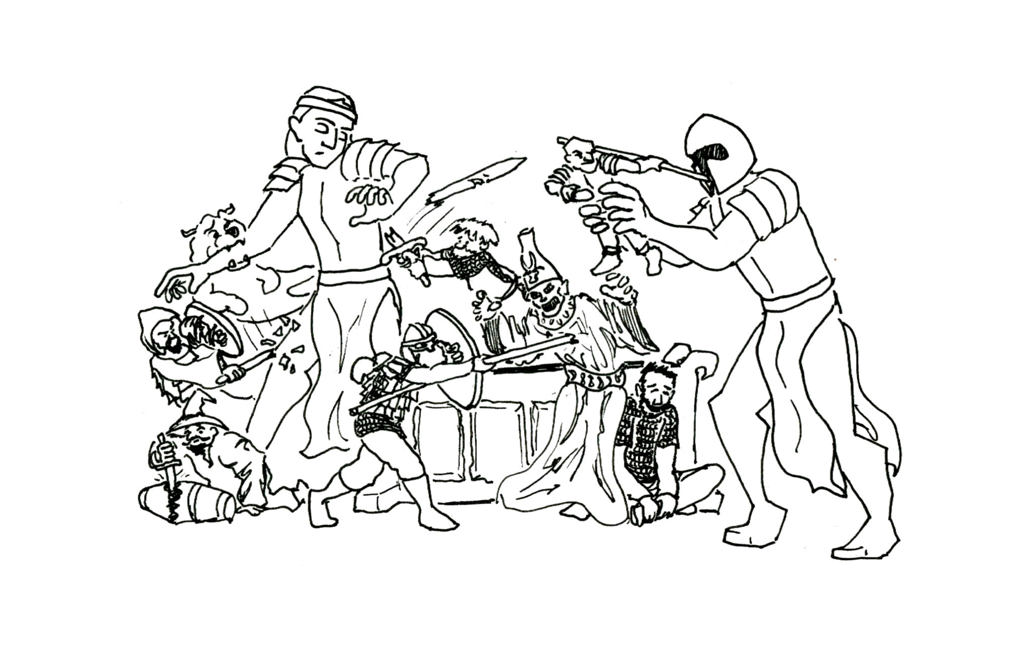 Rarder hunkered down behind his magical one-way shield and charged the figure. Ignoring the stomach-churning cry of Alfredward’s sentient sword as it shattered upon a statue, and Koko’s swearing as his cursed mace also shattered on impact but the handle remaining fixed in his grasp, the fighter beat the undead creature back and ran it through with his spear. The figure screamed and collapsed into dust, and Rarder suddenly found himself at peace with the gods, his duty to slay an abomination of equal strength complete, and all was right with the world.