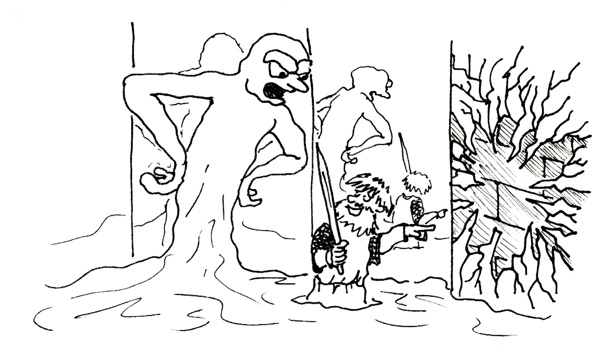 The mist swirled a bit more vigourously but nothing untoward happened to the adventurers. Then they started whacking the other mirrors to see if there might be other doorways behind, and the mist quickly formed up into an angry-looking creature. It clobbered Alfredward to the ground.