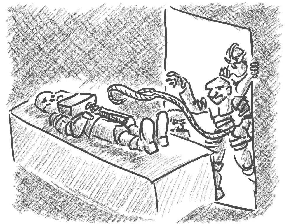 Wary of a trap, the party stood well back while Mandras looped a lasso over the warhammer and hauled it towards the doorway. It fell off the corpse with a clunk and the door came down again immediately, accompanied by the sound of hissing gas. Not wishing to find out what that gas might do right now, the location was marked down and the band of adventurers marched on.