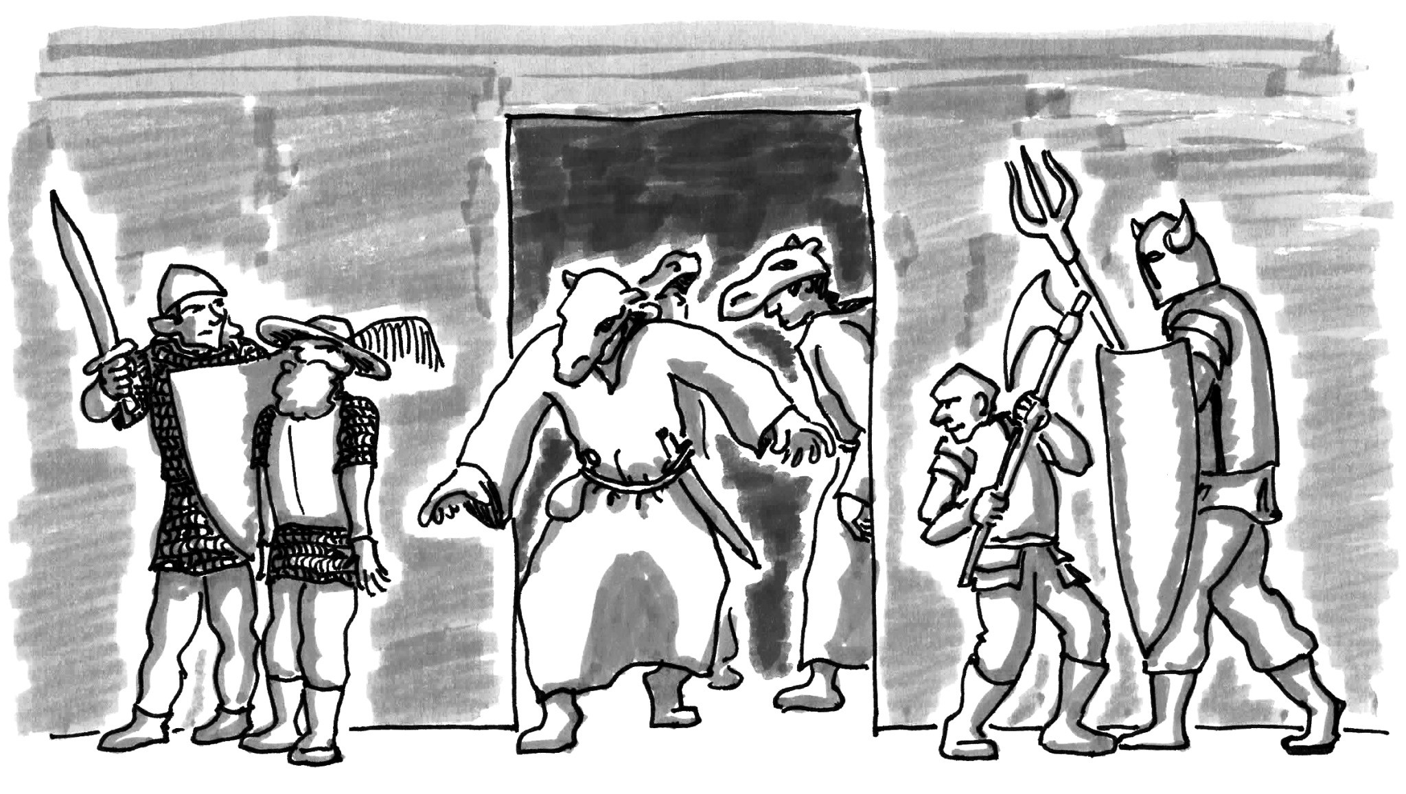 The party then spent some time searching the room for hidden exits, but were interrupted by the sound of indistinct voices down the corridor from which they’d come. Dousing their light and sending a dwarf to spy in the dark, they observed half a dozen robed figures with camel-shaped masks and walking towards them in a peculiar, deliberate manner. The adventurers flanked the doorway and Simon tried to cast a slumbering enchantment upon the group.