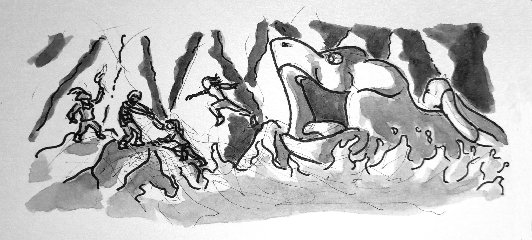 It opened out into a great pool of water but there was a partial rim of rockiness above the water level. Sending their new thief retainers over a gap to tie a series of ropes and pitons to allow for easier access, they paused as the water sloshed and then spilled up and over their feet. An enormous head moved into the torchlight and everyone beat a very hasty retreated. It seemed they'd found the creature the selkie had warned them about.