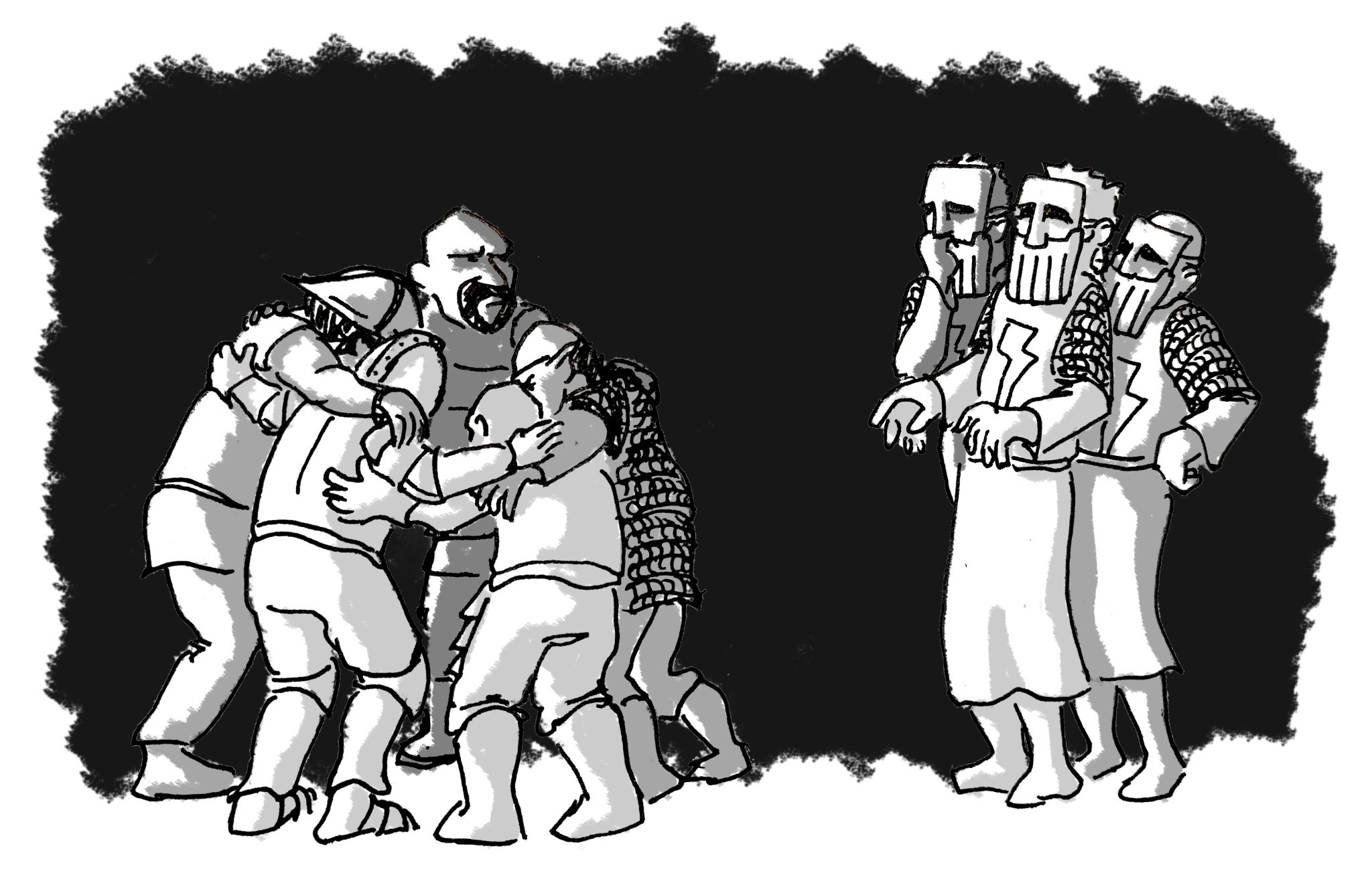 Eventually Mandras was also volunteered to go ahead of the party, though this time with the remit to approach these armed fighters initially for a chat. The robed men summoned another figure from another room who introduced himself as Kanadius, follower of Gorm. He asked the adventurers whether they followed Gorm, Usamigaras or Madarua. Determining that these were the three gods represented atop the pyramid, the adventurers declared themselves the freelance party who had slain Malachie.