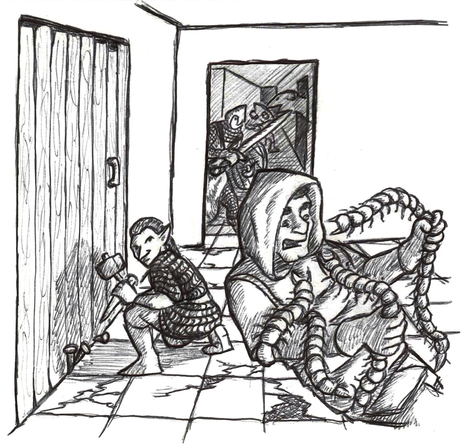 Spying the floor to the other side of the villa as being distinctly rotten, the adventurers opted to return to near their entry point where they’d seen a set of stairs going down. They explored the kitchen and a further room with stairs leading underground. Tyrion started spiking the door shut to avoid anything from below sneaking up behind them, while Juttery investigated the kitchen’s storage and the others breached a door further down the corridor. Just as Konrad kicked open the door and was met by the jaws of a 9ft-long weasel clamping over his arm, Juttery found himself buried under several giant centipedes bursting from a cupboard.