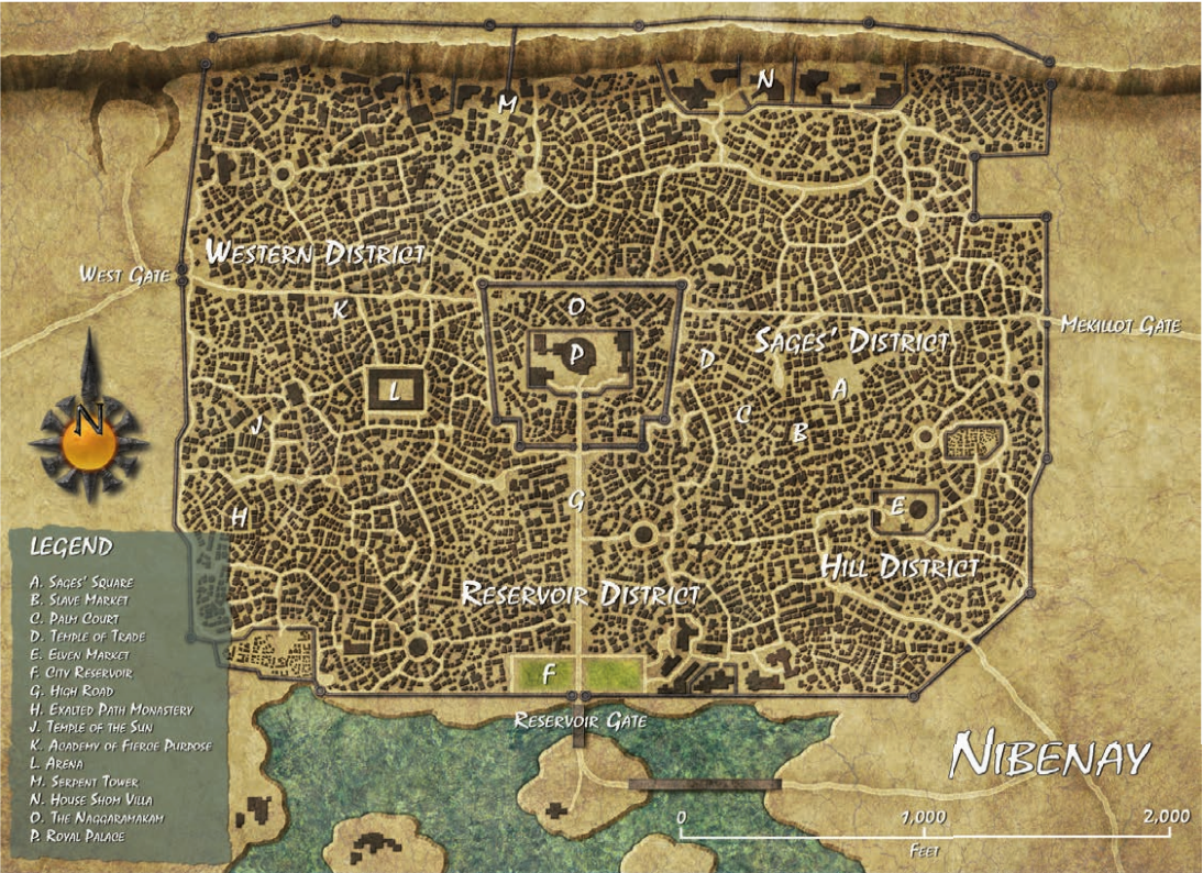 Nibenay is an ancient, decadent city-state under the rule of a distant and mysterious sorcerer-king. Population: Roughly 24,000 people live in Nibenay proper, with a similar number in outlying tenant farms and villages. Most of the population is human, with sizable minorities of half-giants, elves, and half-elves.