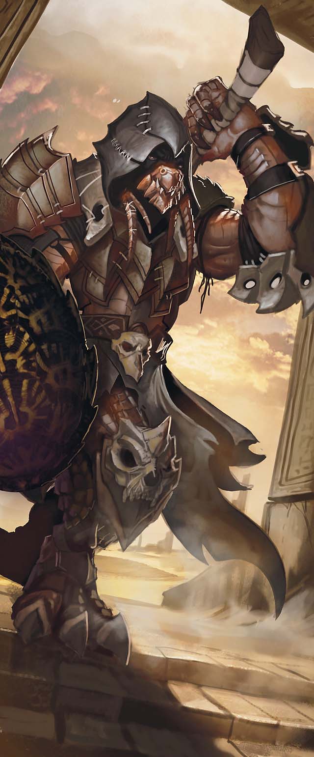 The dragonborn are not a numerous people. They live in tight-knit clans that often share a secret citadel or tower in the wastes. Clan members roam far from their mysterious retreats, looking after the group’s interests. Some dragonborn clans take part in the slave trade, hiring raiders or mercenaries of other races to serve as their slave catchers. Dragonborn who object to trafficking in slaves often earn a living as deal brokers, moneylenders, or speculators. They are also renowned as sorcerers for hire. Dragonborn clans strike deals with the sorcerer-kings of various city-states, paying richly for licenses or dispensations to practice arcane magic in those locations. Nobles, wealthy merchants, and templars have need of a sorcerer clan’s services and pay very well for them. Naturally, members of the Veiled Alliance (and anyone else suspicious of arcane magic) regard dragonborn with suspicion