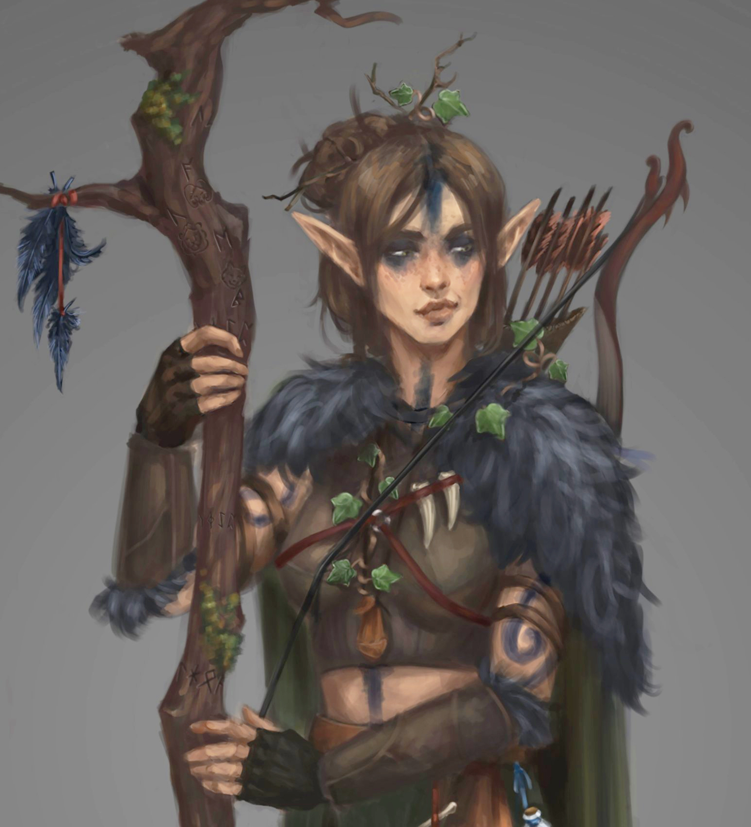 A differenza degli elfi imperiali, gli elfi dei boschi hanno la pelle più tendente al rame, con qualche traccia di verde.