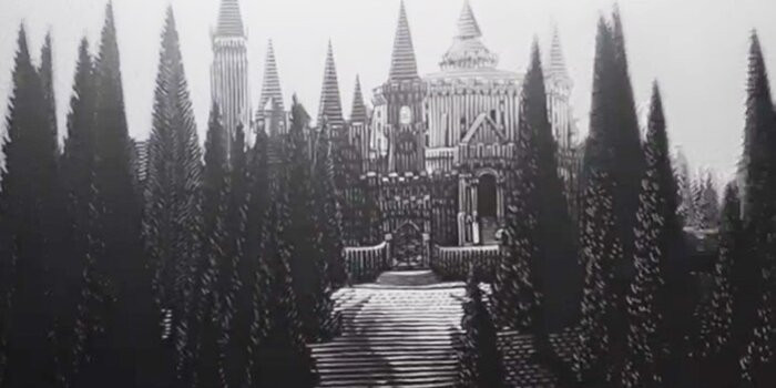 Description : Les élèves d'Ilvermorny étudient dans un château de granite qui n'était à l'origine qu'une modeste maison de pierre. Deux statues de marbre représentant Isolt Sayre et James Steward sont présentes de part et d'autre de la grande porte du château.[2] L'école est entourée par un mur de pierre agrémenté de petites tours. L'accès au domaine se fait par un portail sur lequel est gravé les armoiries de l'école ainsi qu'un noeud gordien représentant la broche d'Isolt. Derrière les grandes portes se trouve un hall circulaire surmonté d'une coupole en verre en guise de plafond. À l'étage de cette pièce se trouve un balcon en bois qui court tout le long des murs. En bas, le hall d'entrée n'est agrémenté que de quatre statues représentant un Serpent cornu, un Womatou, un Oiseau-Tonnerre et un Puckwoodgenie qui permettent aux nouveaux arrivants d'être répartis dans les différentes maisons de l'école. En dehors des murs de l'école, à l'endroit où a été enterrée la baguette de Salazar Serpentard, se trouve une variété inconnue d'amourette dont les feuilles ont de puissantes propriétés curatives.