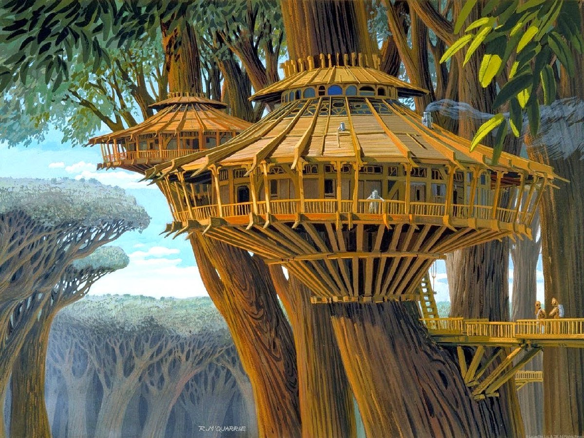 Rather than stone or glass, the house seems to have been formed from the living branches of four sturdy oak trees. These have been shaped and woven to create three thick platforms.