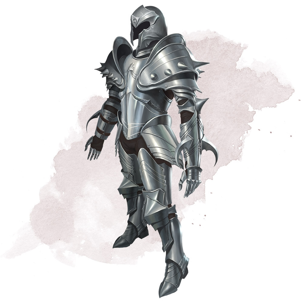 Plate consists of shaped, interlocking metal plates to cover the entire body. A suit of plate includes gauntlets, heavy leather boots, a visored helmet, and thick layers of padding underneath the armor. Buckles and straps distribute the weight over the body.