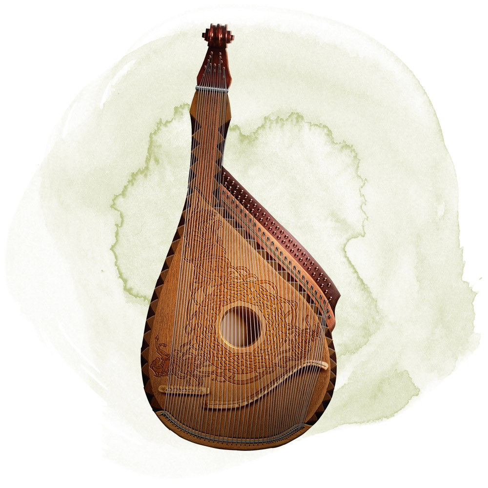 Fochlucan bandores were 3-string instruments similar to lutes. It was fashioned from striated maple wood and inset with tiger's eye stones.