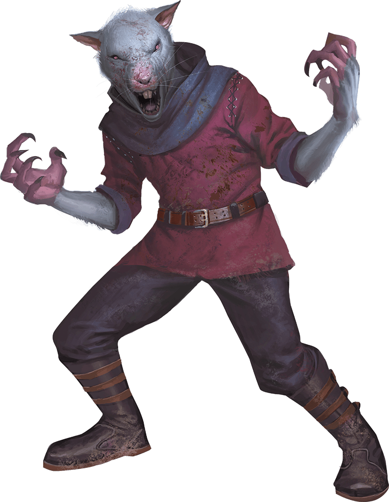 The wererat can use its action to polymorph into a rat-humanoid hybrid or into a giant rat, or back into its true form, which is humanoid. Its statistics, other than its size, are the same in each form. Any equipment it is wearing or carrying isn't transformed. It reverts to its true form if it dies.