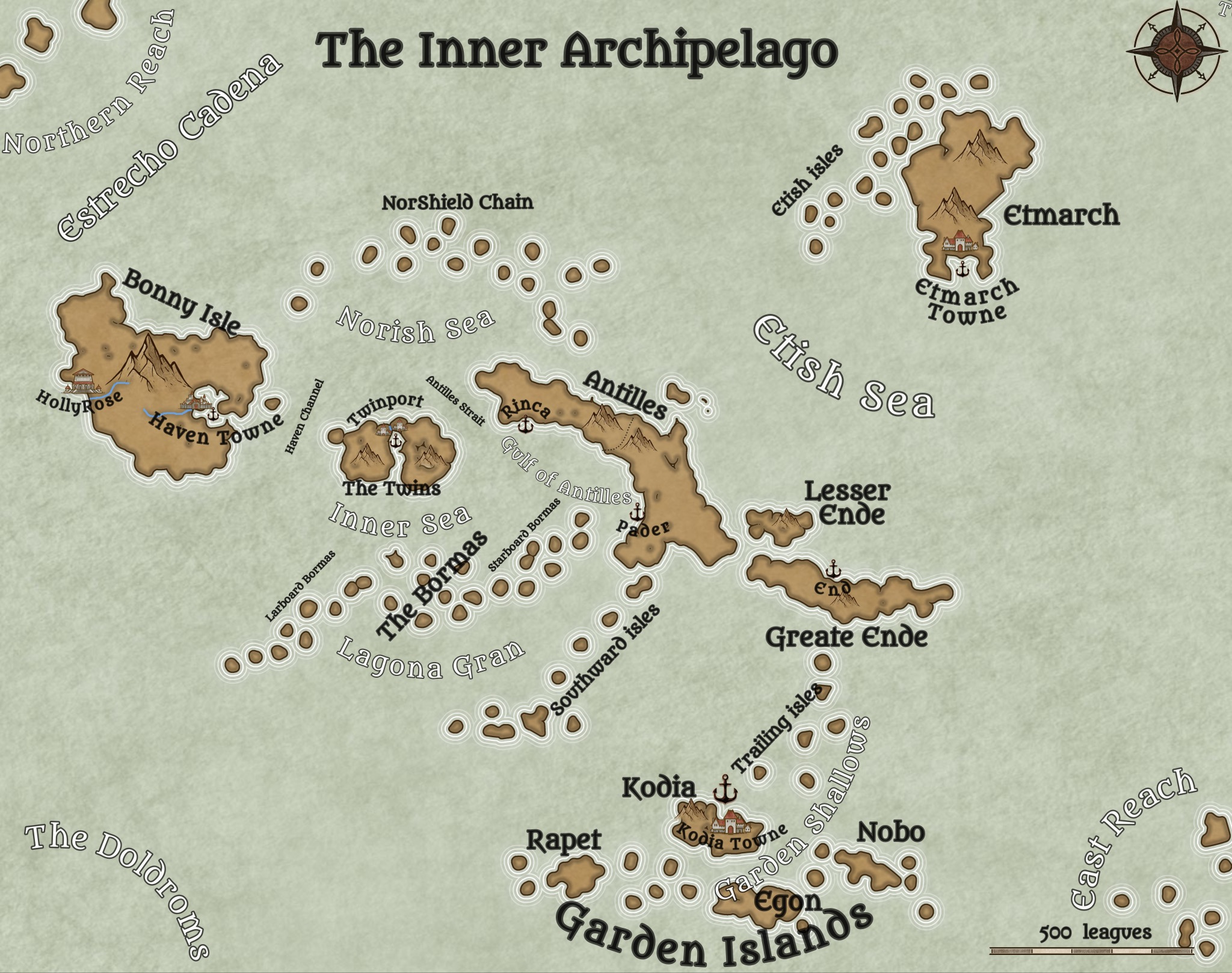 The Thousand Isles is a tropical archipelago, stretching over approximately 5000 leagues (15,000 of our miles) of ocean west of Valoria and north of Great Mbo. It contains twelve large extinct volcanoes, ten large islands in an The Inner Archipelago and hundreds of smaller ones scattered in two outer reaches (the The Northern and Southern Reach)