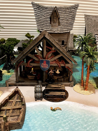 The Lucky Kraken is a popular dive bar and eatery in The Bayouthat opens directly to Skull Bay. The interior is given over entirely to a kitchen, with a bar opening into the extensive open air veranda where customers sit, eat and drink. In good weather the staff set up tables on the beach itself.