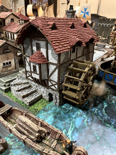 The mill not only grinds grain, but through a clever system of pulleys and blocks can be used to provide motive force for various activities performed by the Riverside Docks