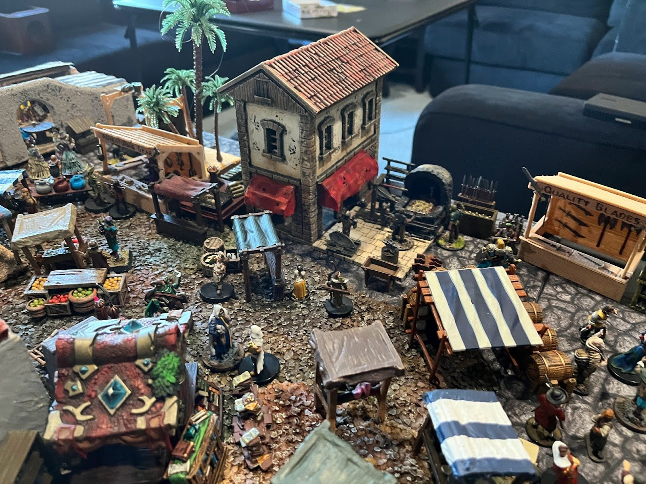 Next to the moneychanger, a stall with several fine suits of armor displayed and a sign reading "Adventuring Gear" does a brisk business. Another stall on the opposite side seems to sell weapons and clothing of fine quality. Finally a large stall almost buried by stacks of beer barrels and racks and cases of wine does an extremely brisk business.