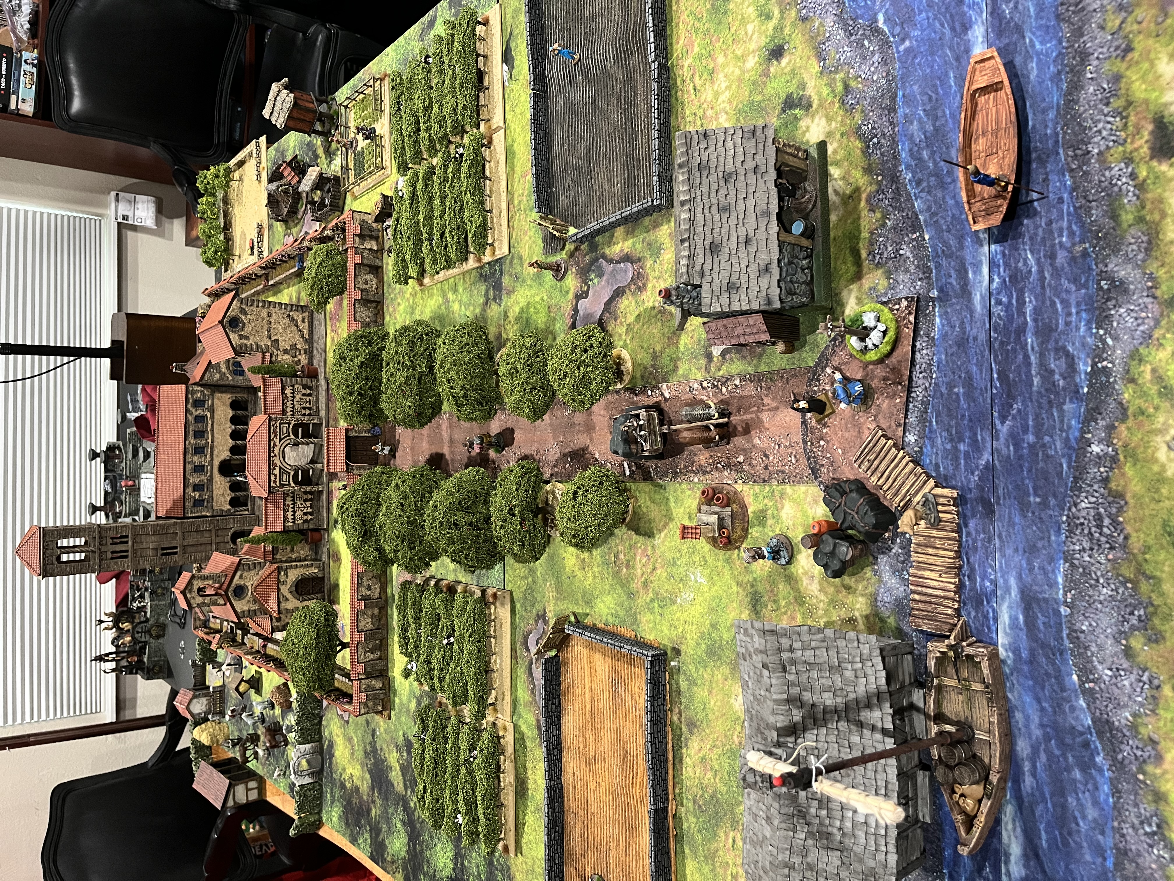 Eventually you round a bend in the quickly narrowing stream and notice a cluster of buildings and small dock about a quarter mile ahead. A dozen roughly thatched round huts surround a tall stone statue, bookended by what appears to be a small chapel on one end and a large two story stone edifice on the other. A water mill sits along the riverbank on the opposite side from the chapel.  A rickety wooden bridge spans the stream, now no more then a score of yards wide.