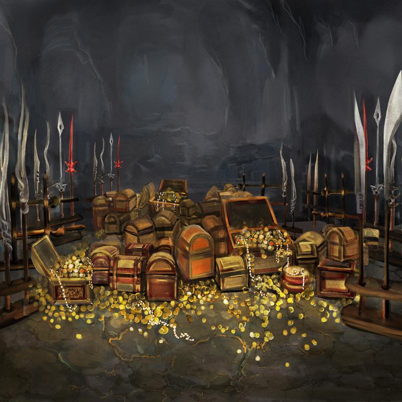 This vault opens off the Library of St. Ursula. The strong iron door hangs open, revealing row after row of gold and silver bars, in addition to several strongly bound iron chests. The chests also stand open, revealing the gold and silver coins that fill them.