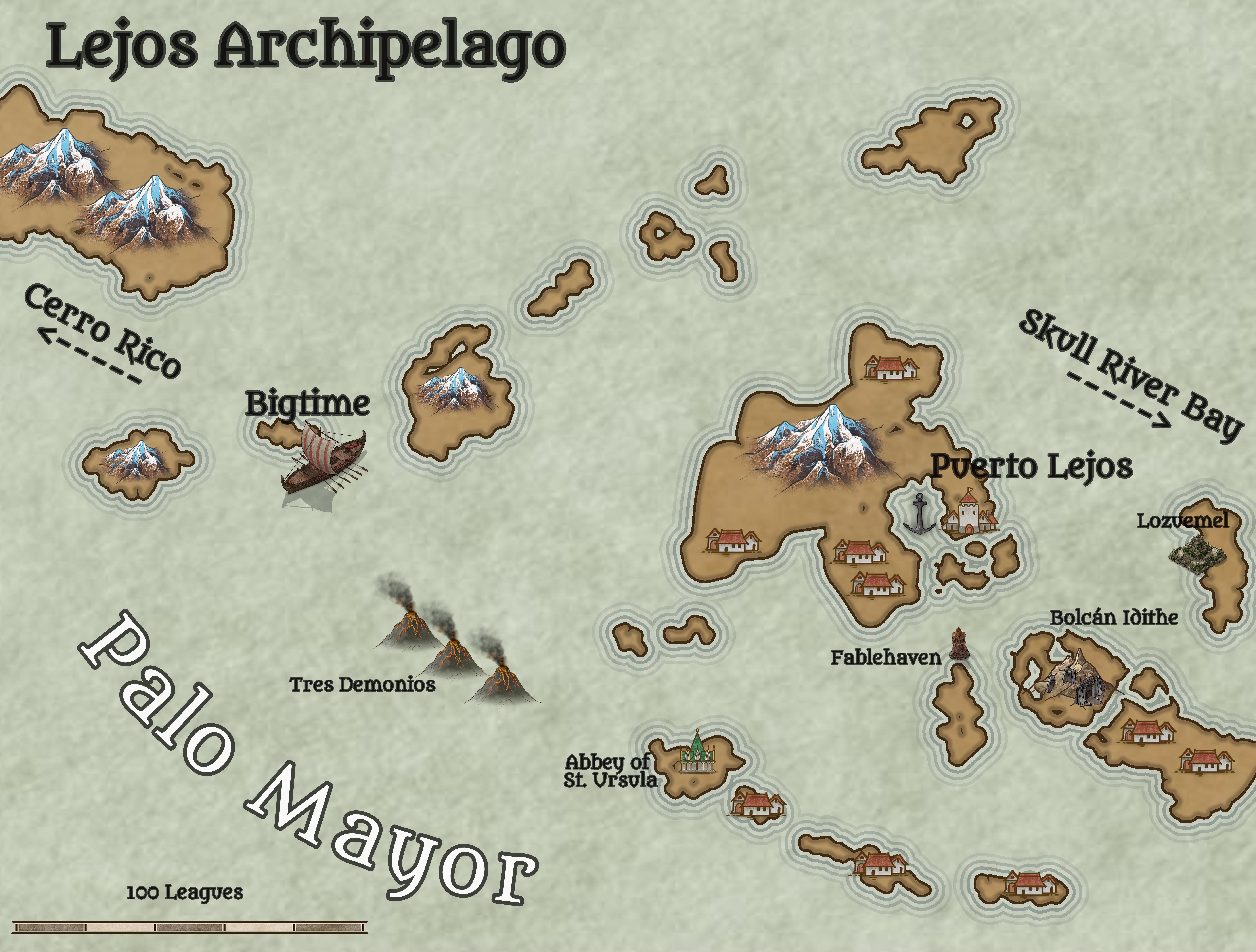 The Lejos Archipelago (Map) is a chain of rich and populous islands, located in The Northern Reach, midway between Skull River Bay and Gianthome along the Palo Mejor. Despite being on the very edge of civilization, the region is a major agricultural center, and trade between the area and the The Inner Archipelago is rich and profitable. Recently, that relative prosperity has been jeopardized as the people of the archipelago have come under increasing pressure from raiders out of Gianthome.