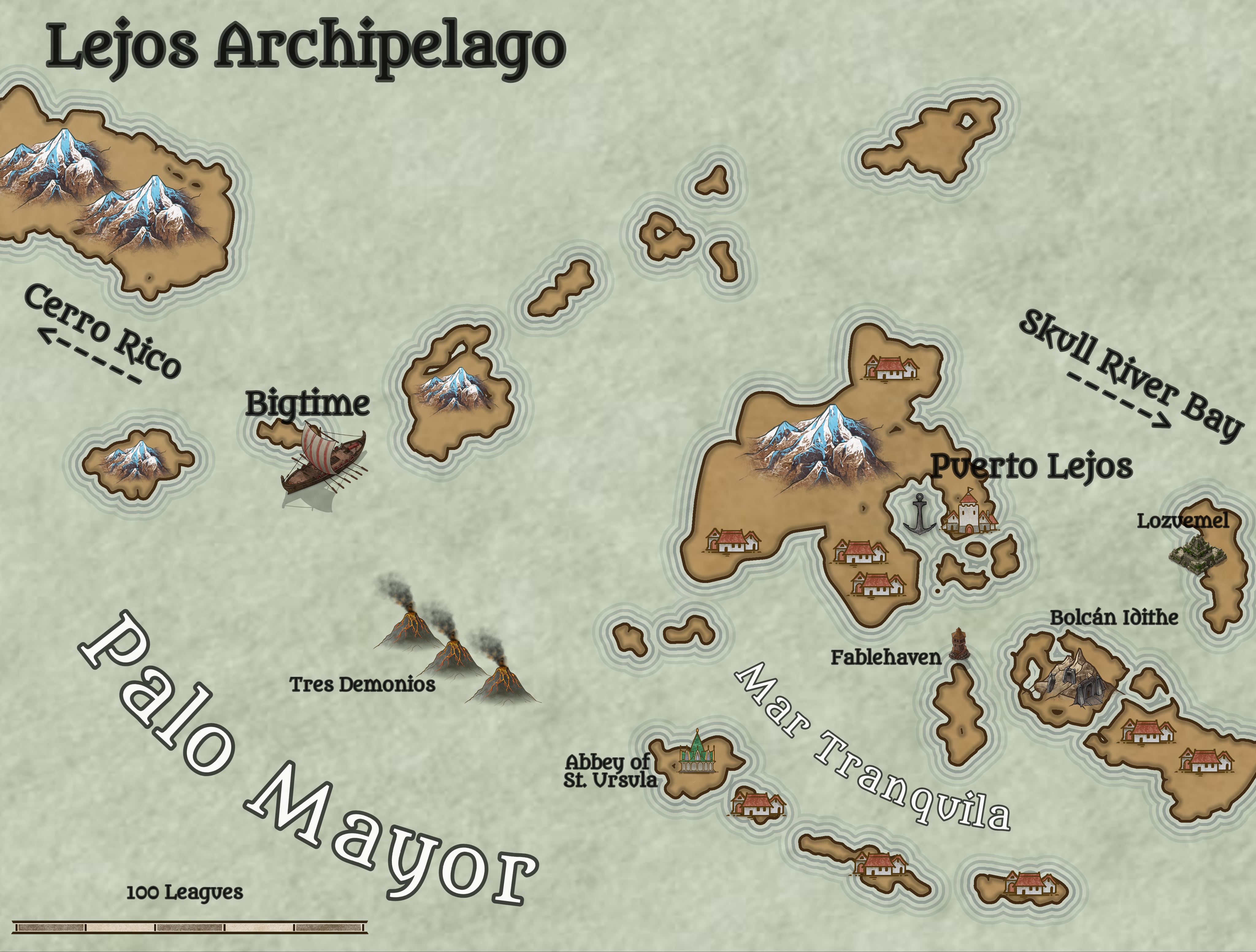 The Lejos Archipelago is a chain of rich and populous islands, located in The Northern Reach midway out along the Palo Mejor, the central chain of islands.