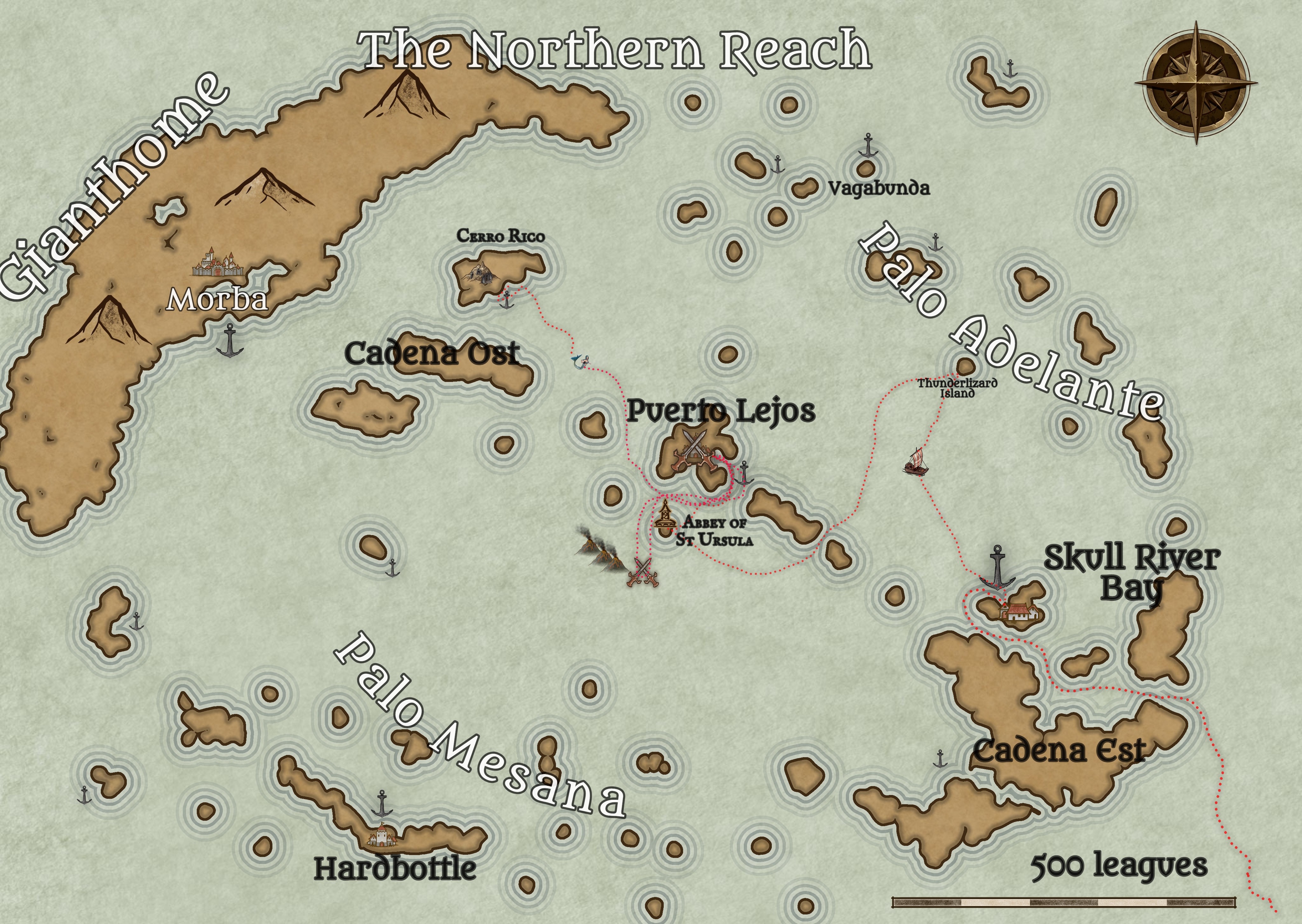 The Lady Jezebel leaves civilization behind, sailing from Puerto Lejos to Cerro Rico. On the way she encounters the merfolk of the The Northern Reach and explores a ruined, sunken city of Lost Farbosheia. The voyage takes 30 days.