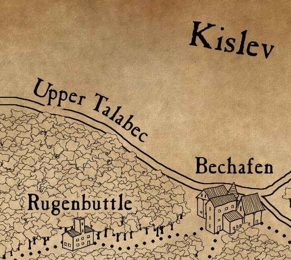 Położone na południowym brzegu Górnego Talabeku, Bechafen to zwarte miasto stłoczone za murami obronnymi. Budynki są wąskie i wysokie, pochylone pod zawrotnymi kątami nad alejkami, które bardziej przypominają zaciemnione tunele. Zbudowane z ciemnego drewna Wielkiego Lasu, konstrukcje Bechafen mają ponury wygląd, którego nie jest w stanie rozproszyć żadna ilość bielonego i kolorowego wykończenia.