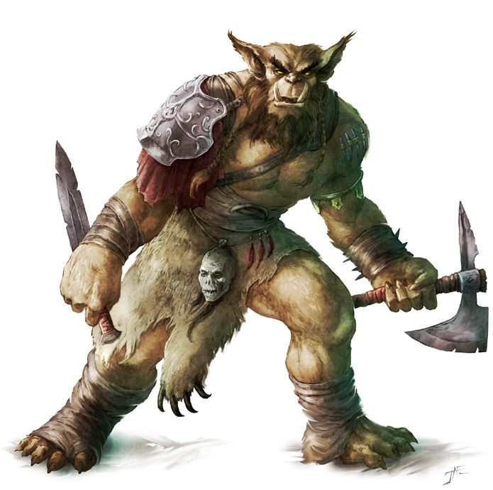 Bugbears feature in the nightmare tales of many races great, hairy beasts that creep through the shadows as quiet as cats. If you walk alone in the woods, a bugbear will reach out of the bushes and strangle you. If you stray too far from the house at night, bugbears will scoop you up to devour you in their den. If a bugbear cuts off your head, your soul stays trapped inside, and the bugbears use your head to magically command all whom you once knew. Lurid tales such as these have flowered from the seeds of truth. Bugbears do rely on stealth and strength to attack, preferring to operate at night. They do take the heads of enemy leaders, but they are no more likely to eat people indiscriminately than humans are. Bugbears aren't likely to attack lone travelers or wandering children unless they clearly have something to gain by doing so. From the viewpoint of the rest of the world, their aggression and savagery are thankfully offset by their rarity and lethargy.