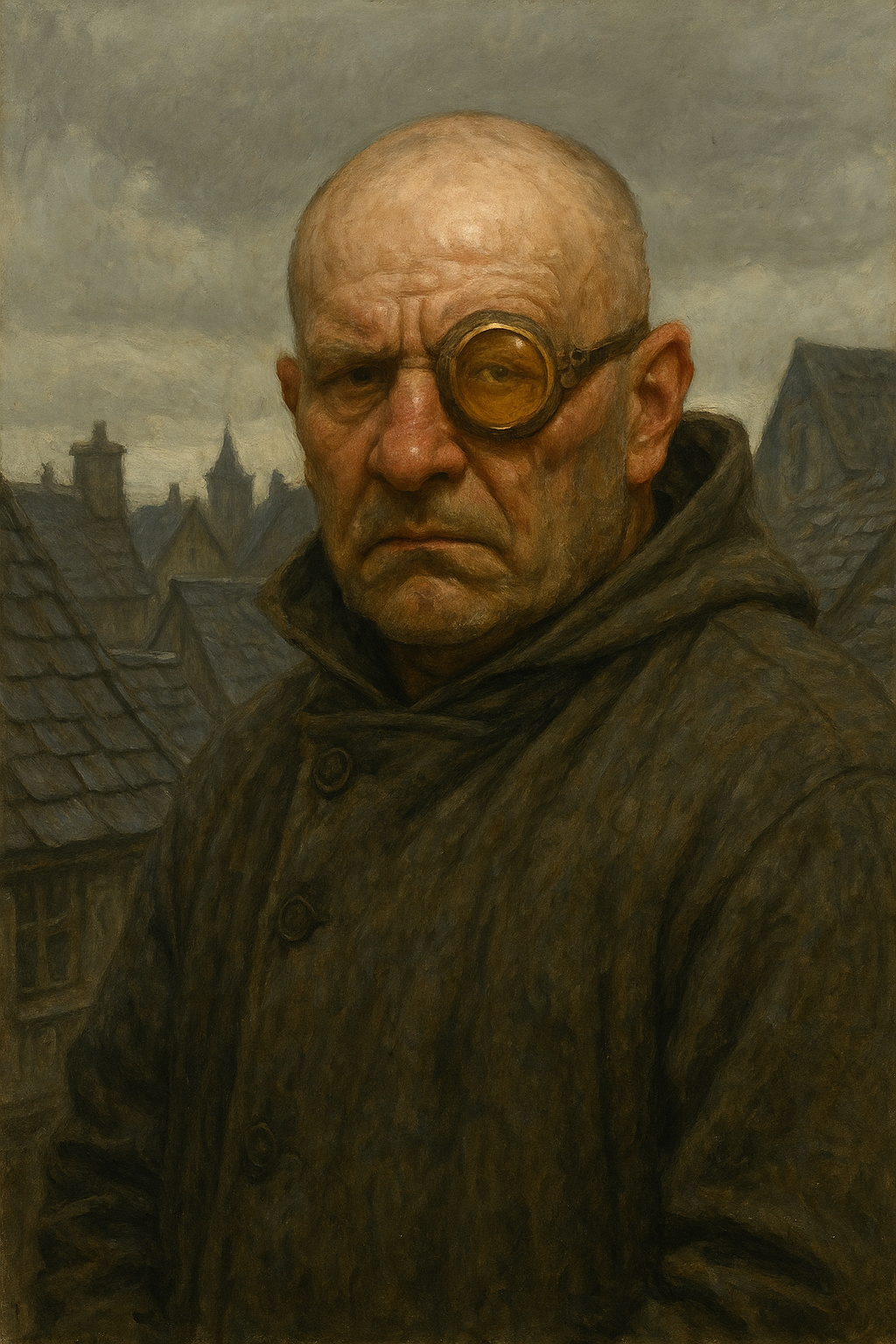 Homme trapu au torse épais, cou invisible, toujours emmitouflé dans un manteau gris à col relevé. Il porte constamment un lentille artisanale grossissante : un œil nu, l’autre surmonté d’une lentille ambrée fixée à une monture de cuivre battu. Il a le crâne rasé, la peau grêlée et les mains tavelées de cicatrices anciennes.