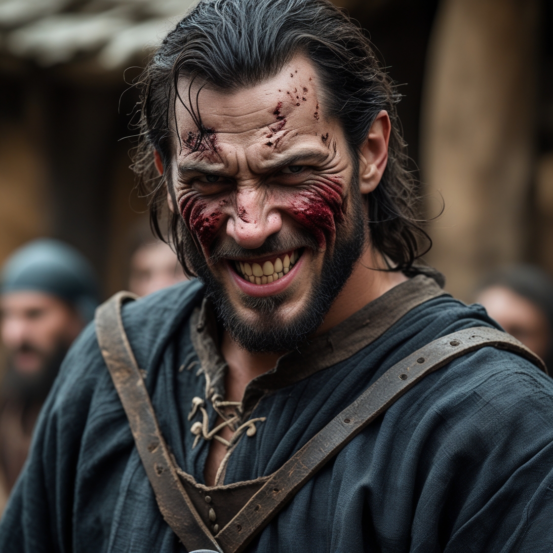 Le visage cabossé par des bagarres anciennes, nez tordu, sourire carnassier. Porte toujours une dague dissimulée.