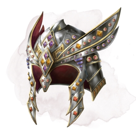 Este resplandeciente yelmo tiene incrustados 1d10 diamantes, 2d10 rubíes, 3d10 ópalos de fuego y 3d10 ópalos. Cualquier gema que se arranque del yelmo se convierte en polvo. Cuando todas las gemas se eliminan o destruyen, el yelmo pierde su magia.