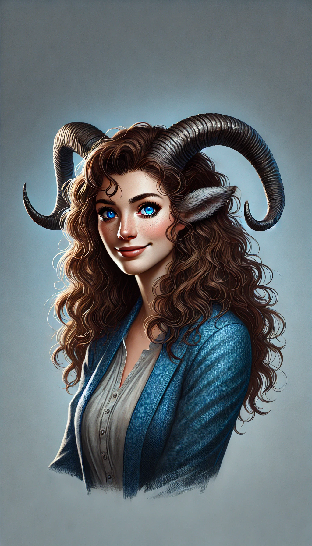 Lyra hat die typische Erscheinung einer Satyrin mit leicht gebogenen Hörnern, die aus ihrem dichten, lockigen Haar hervorragen. Ihr Haar ist von einem tiefen, schokoladenbraunen Farbton und fällt in sanften Wellen über ihre Schultern. Ihre Augen leuchten in einem klaren Blau, das die Weite des Himmels widerspiegelt, und ihr Lächeln ist warm und einladend.