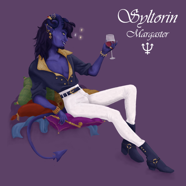 By the Grace of Calistria, Dauphin of Vienarya, Duke of the Whisperwoods, Count of Elphestos, Sovereign of the Amethyst Isles and the Bloodthorn Woods, High Lord of the Twin-Cities, the Hyacinth Prince, the Hearteater, the Horn-Masked, the Flame-tongued, His Royal Highness Syltorin Starsong of House Margaster. A man of many names and titles, a man of many masks - just like the court expects a prince to be. And in his case, it worked in his favour, for he was born a Tiefling, a Hellspawn.