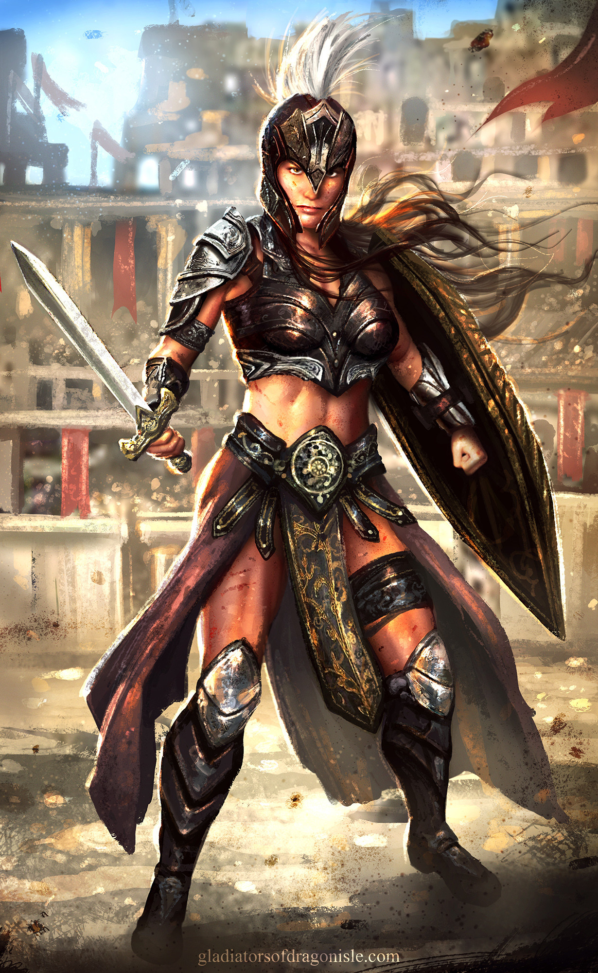 Years passed and Iva was now thirteen years old, with a physique far outmatching even adult men, towering over others at an amazing height of 6'2", yet her entourage knew she was only about to grow taller. The neighborhood kids loved her like a big sister and she doted on the younger girls while roughhousing with teenagers. Clearly beloved by everyone and acknowledged by even Ayman, she ignored her mother's plea and enrolled at the colosseum under the alias of "Lady of Flames", which drew a bit of laughter from the audience during her first fight although it was drowned out by her friends' cheers. The gates opened and her first opponent appeared : A rather unimpressive skinny boy with dead eyes. They looked at each others for a bit, Iva not understanding why he looked the way he did, before the signal was given to start the fight. He rushed towards her, mace ready to strike, only for her shield to bash him right in the face, knocking him down, before her foot slammed down painfully onto his wrist and her longsword caressed his neck. Silence followed as the fight was so unexpectedly short that the announcer did not know how to react. And then the audience erupted in cheers, prompting him to congratulate her as she grinned uncontrollably. She was finally there ! She was like that stunning man she saw as a child ! Granted, her first fight was not as flashy or impressive, but it was only a matter of time ! Performing the same victory lap he did, she walked off the arena as the commentator did not let that slide : "IS SHE DOING IHAB'S MOVE ? BY THE GODS, IS SHE CHALLENGING THE CHAMPION ?! LADIES AND GENTLEMEN, THIS ROOKIE IS FULL OF SURPRISES ! KEEP YOUR BEHINDS RIGHT WHERE THEY ARE, WE WILL BE RIGHT BACK WITH THE NEXT FIGHT AFTER A WORD FROM OUR SPONSOR !"