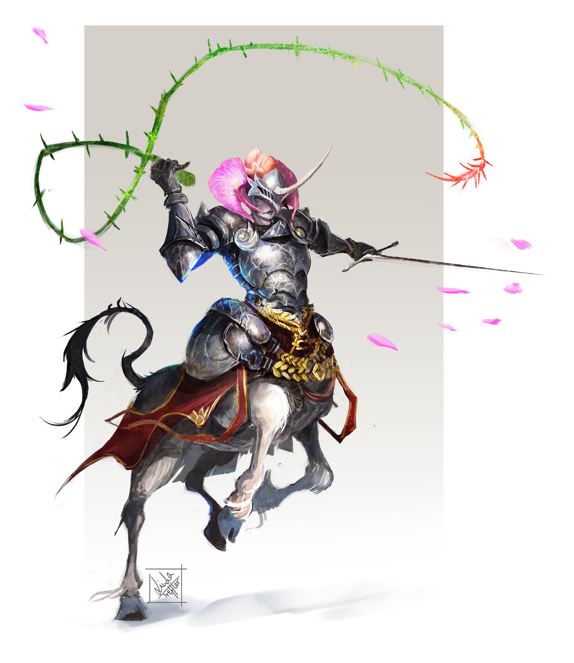 Akanth hails from the steppes and plains of the Green Valley, and serves as an envoy of his tribe, the Briarborn, in Eleutheria. He is an armoured Centaur with a thorny whip and a sword. The visor of his elaborate, uni-horned helmet is enough to fullfil the Visage's customs of wearing a mask during the stay.