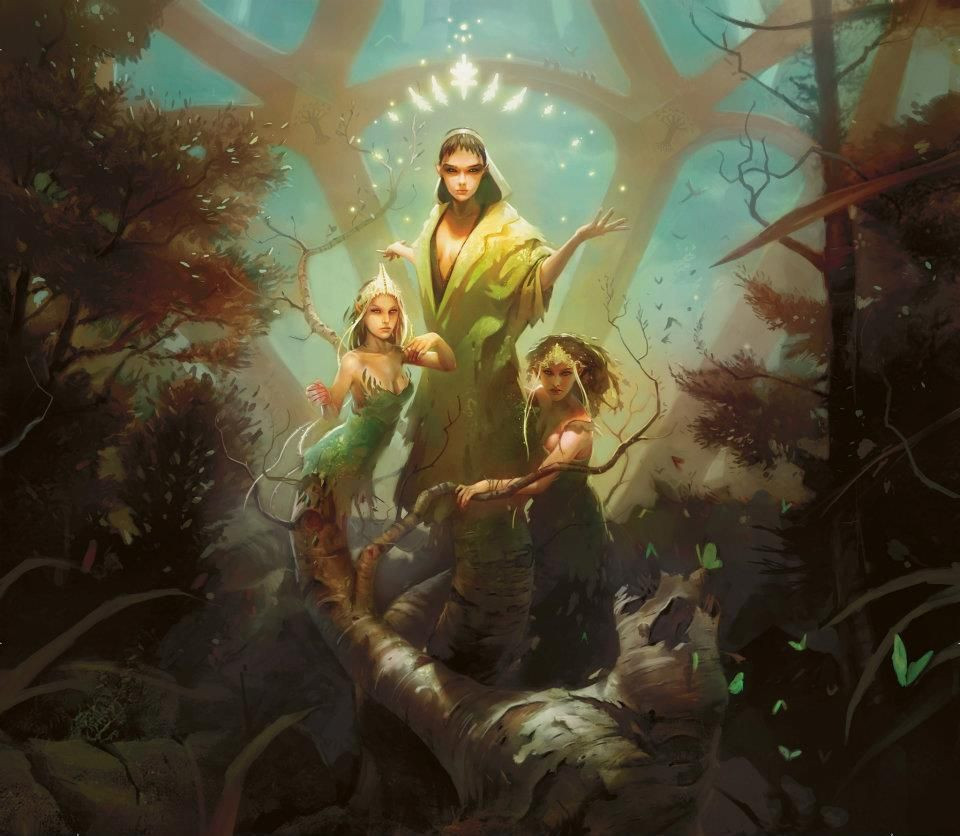 Among the guests, three stand out - a trio of beautiful Dryads, joined together where their legs would be by an elegant swirl of roots. They don't seem to be that limited in their movements, however, and are engaged in three different activities at the same time, chatting away with other patrons, and among themselves. - Viktor |